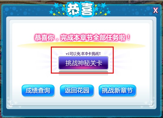 每个章节完成所有的普通关卡以后即可触发神秘关卡。进入神秘关卡需要消耗冲冲冲卡,V1达人可免卡进入第一、二章神秘关卡,V2达人免卡进入第三、四章神秘关卡,第五章神秘关卡只有V3以上达人才可免卡进入。